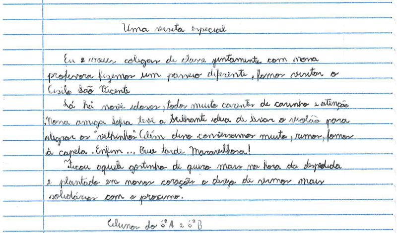 Durante a visita, fomos muito bem acolhidos pelos gentis moradores de lá. Eles parecem ser como uma grande família, muito unidos. A visita nos emocionou muito, pois os idosos muitas vezes pareceram carentes, como se não tivessem com quem dividir seus sentimentos e falar sobre suas experiências vividas.