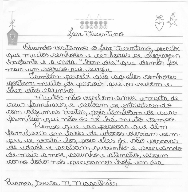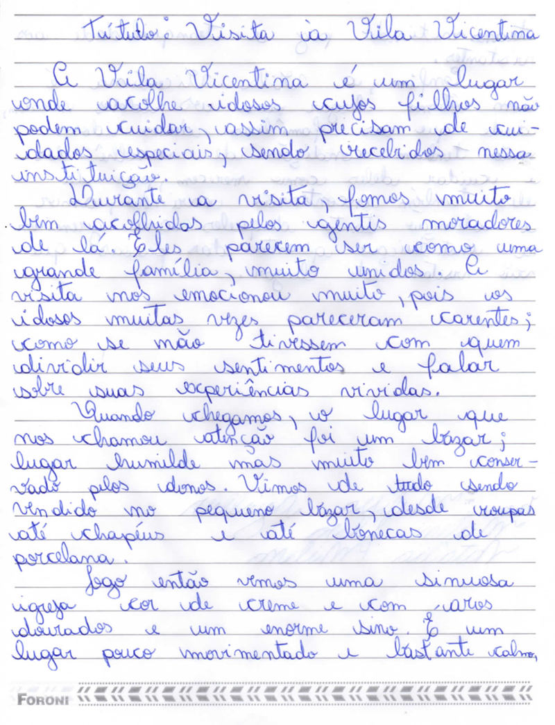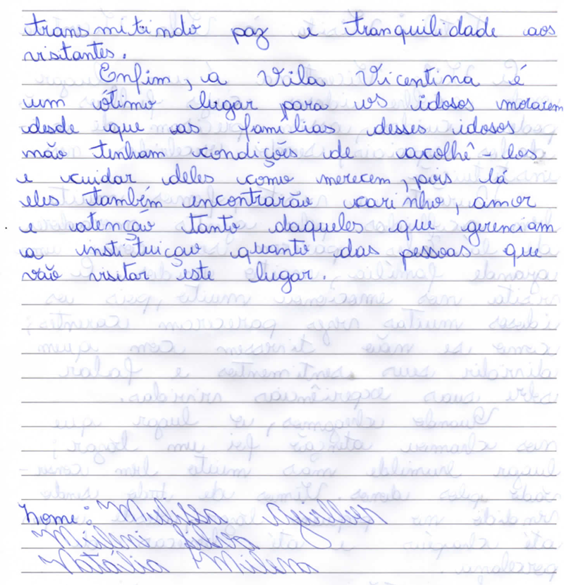 Enfim, a Vila Vicentina é um ótimo lugar para os idosos morarem, desde que as famílias desses idoso não tenham condições de acolhê-los e cuidar deles como merecem, pois lá eles também encontrarão carinho, amor e atenção tanto daqueles que gerenciam a instituição quanto das pessoas que vão visitar este lugar.