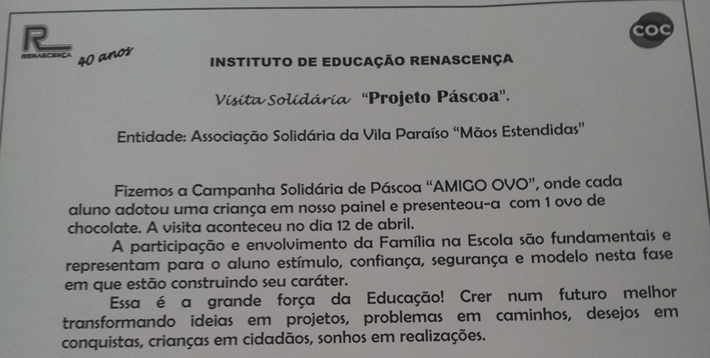 E é vendo crianças e adolescentes acompanhados por seus mestres, que toda a luz que se apagou em muitos corações “anciãos” volte a iluminar. Iluminar olhares já tristes, já apagados, já sem esperanças de uma ação de amor ao próximo.